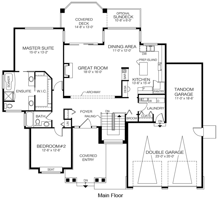 Double pilasters flank the covered entry of this 2-bedroom family home, giving it a stately look. Outdoor entertaining is part of this design, with sliding doors from the great room to the deck .